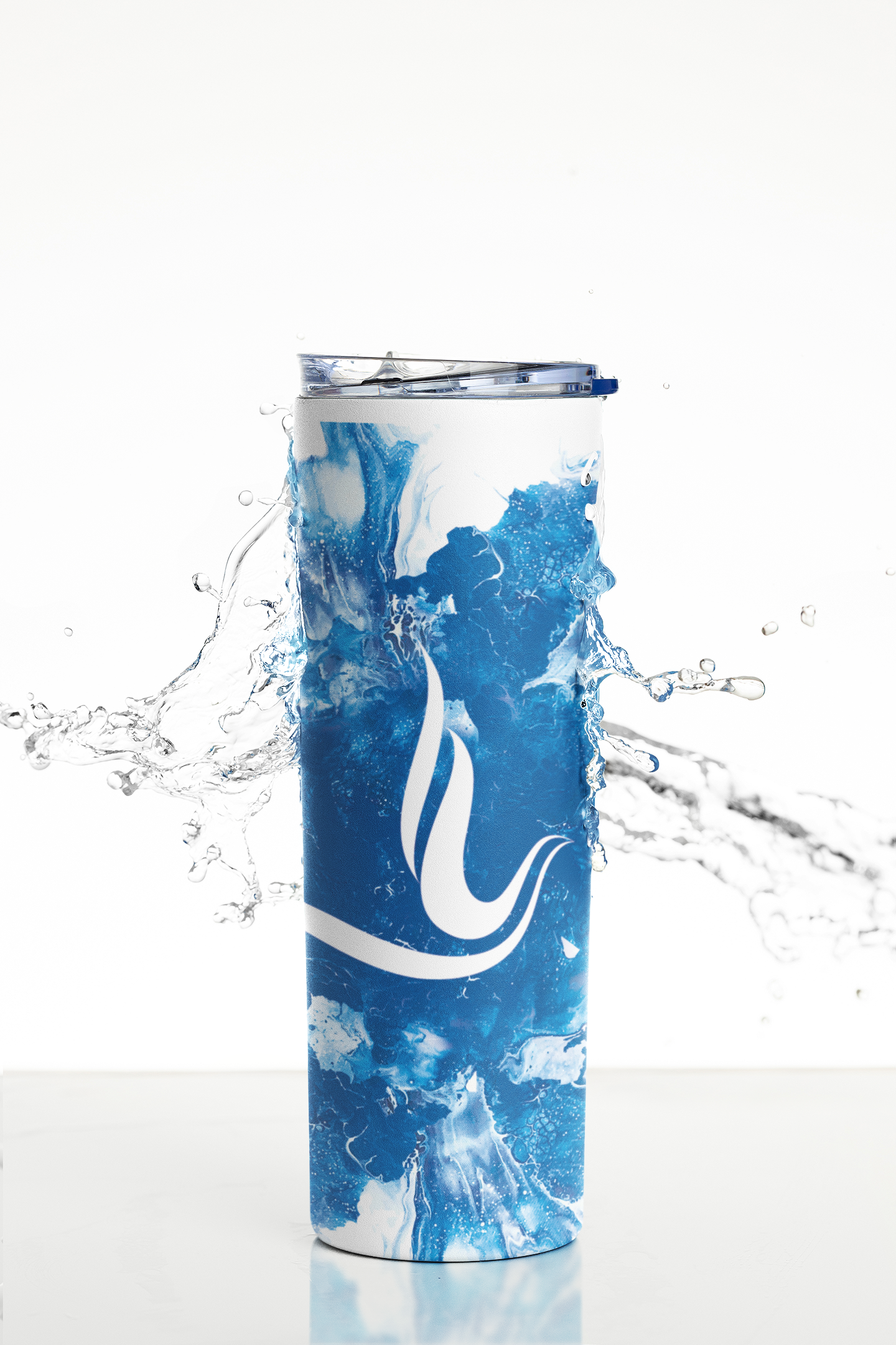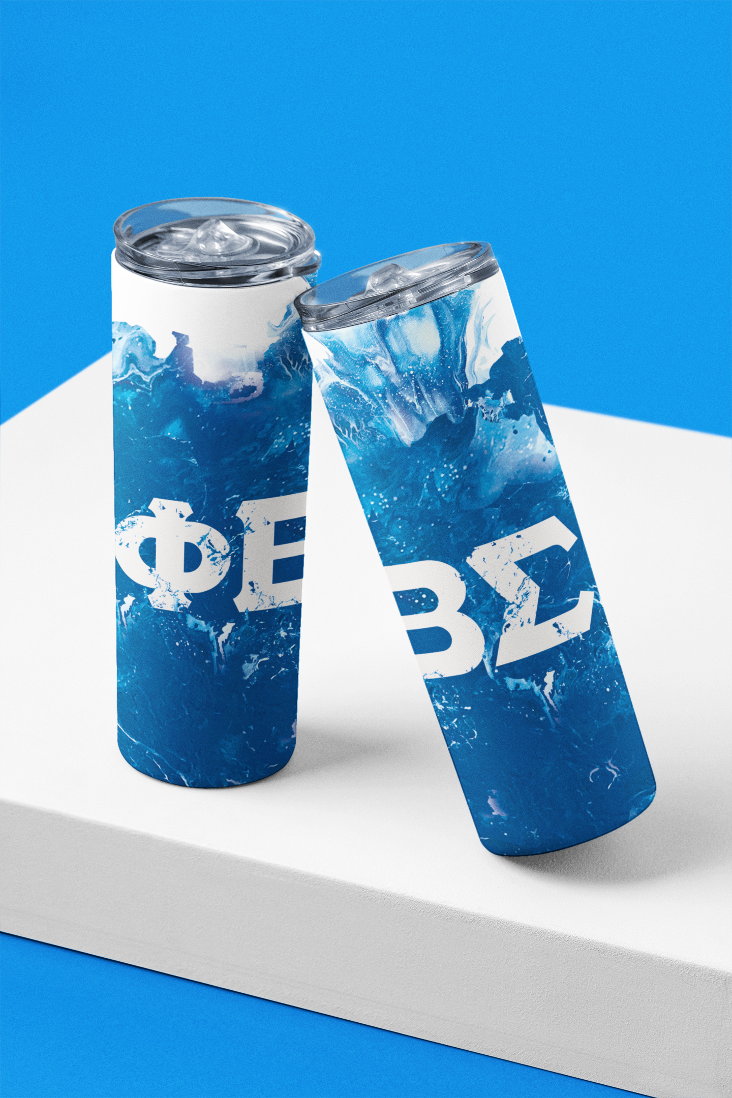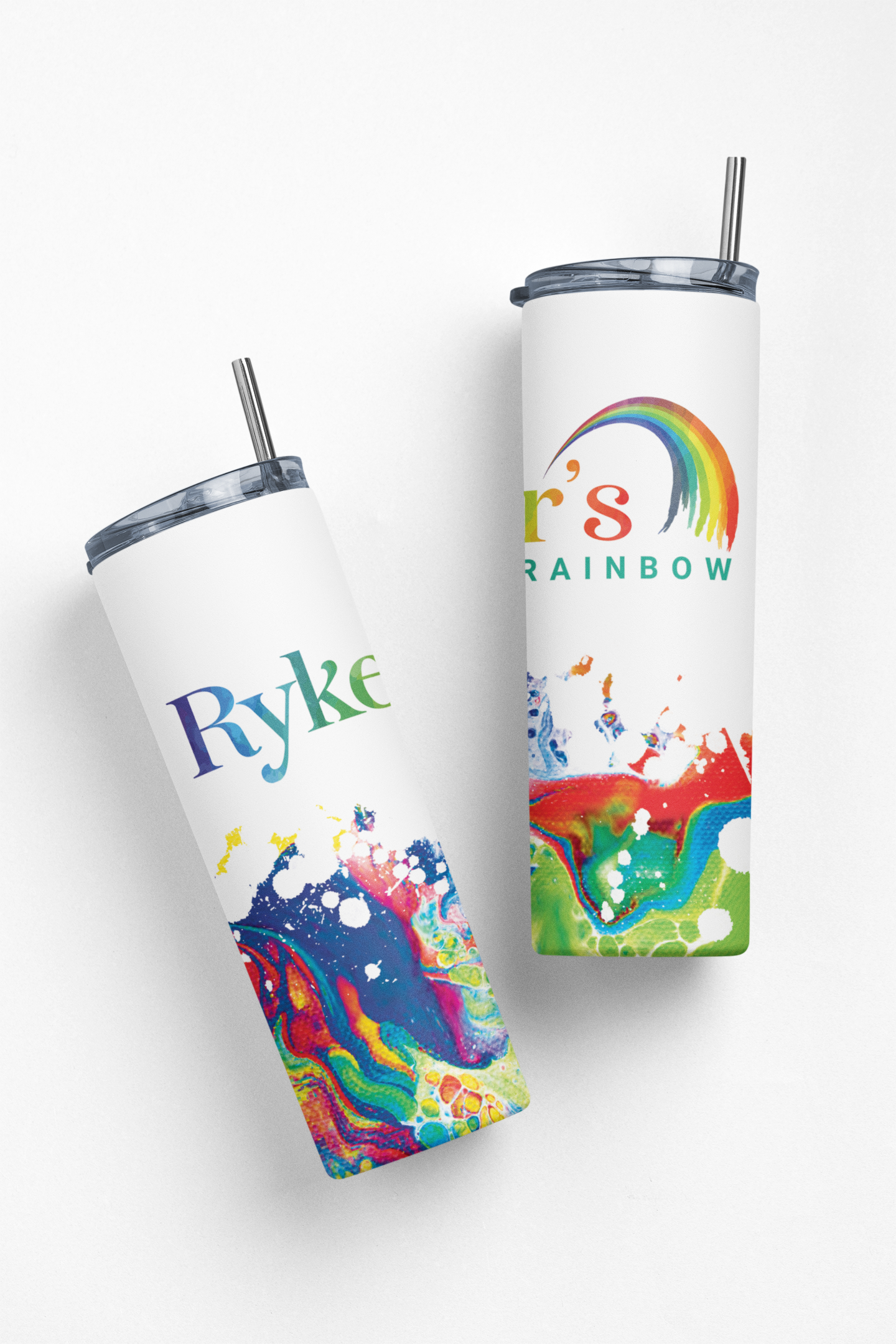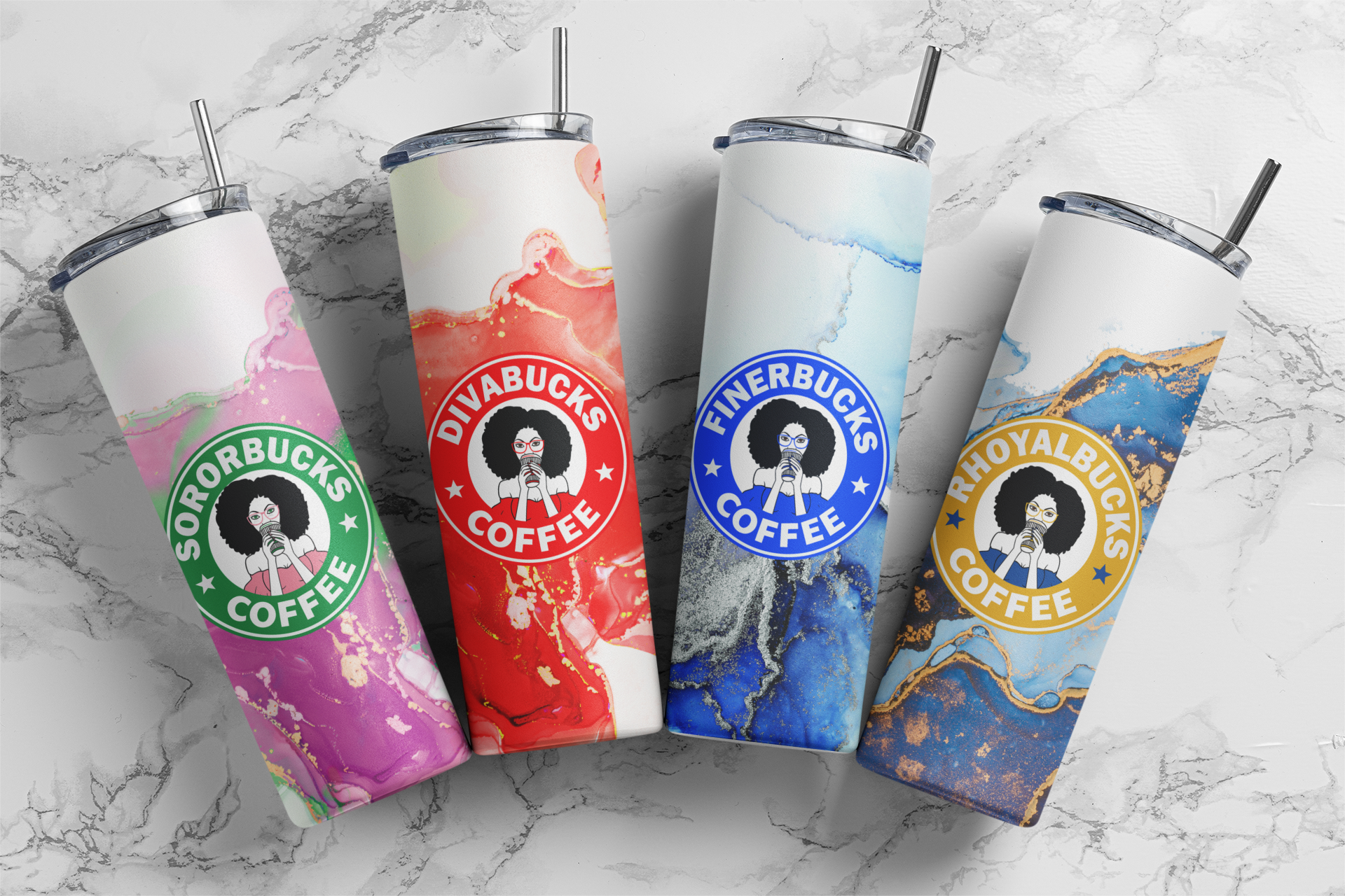 Acrylic paintings that were scanned and translated to digital images, and then used for tumbler designs with matching graphic or logos. The artwork was printed using a sublimation printer, wrapped around the blank tumblers and baked.